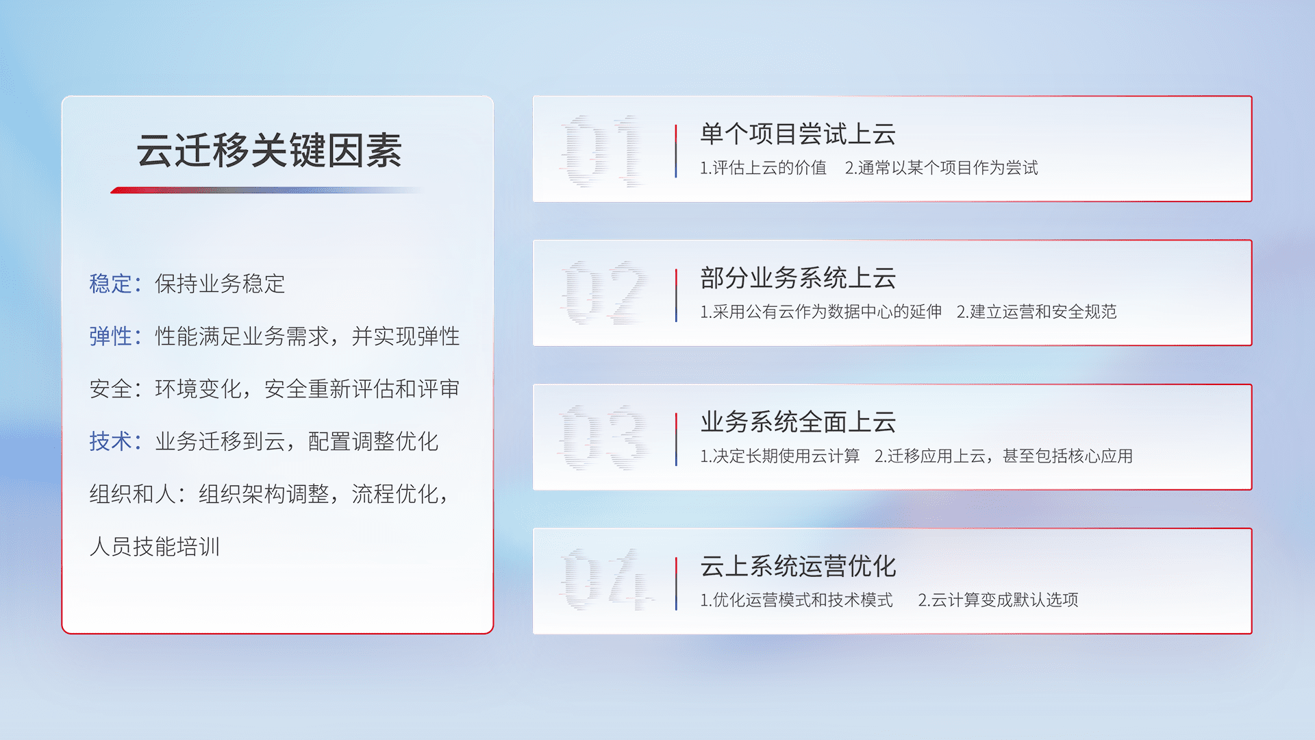 结合实际业务,,,,从规划设计、、、、云平台选型、、云原生改造、、、数据迁移、、集成交付,,迁移全过程为客户识别最佳上云路径,,做好风险识别管理,,,设计网络架构、、、、身份权限、、安全审计合规、、、操作审计、、日志审计、、监控告警策略、、、、多站点容灾设计等,,对云上基础设施进行整体规划,,,提升IT治理水平,,,以满足弹性、、、、高可用、、、高性能的需求。。。。